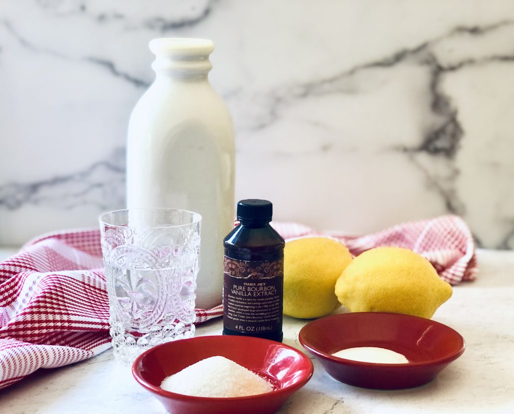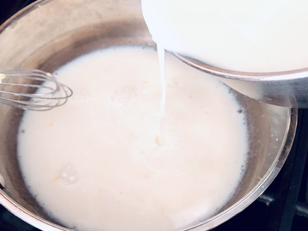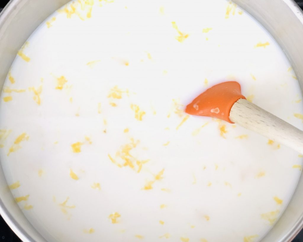 - Place a small sauce pan over low heat, add milk and stir in sugar, vanilla extract and lemon zest. When the sugar has completely dissolved, turn off heat and set aside.