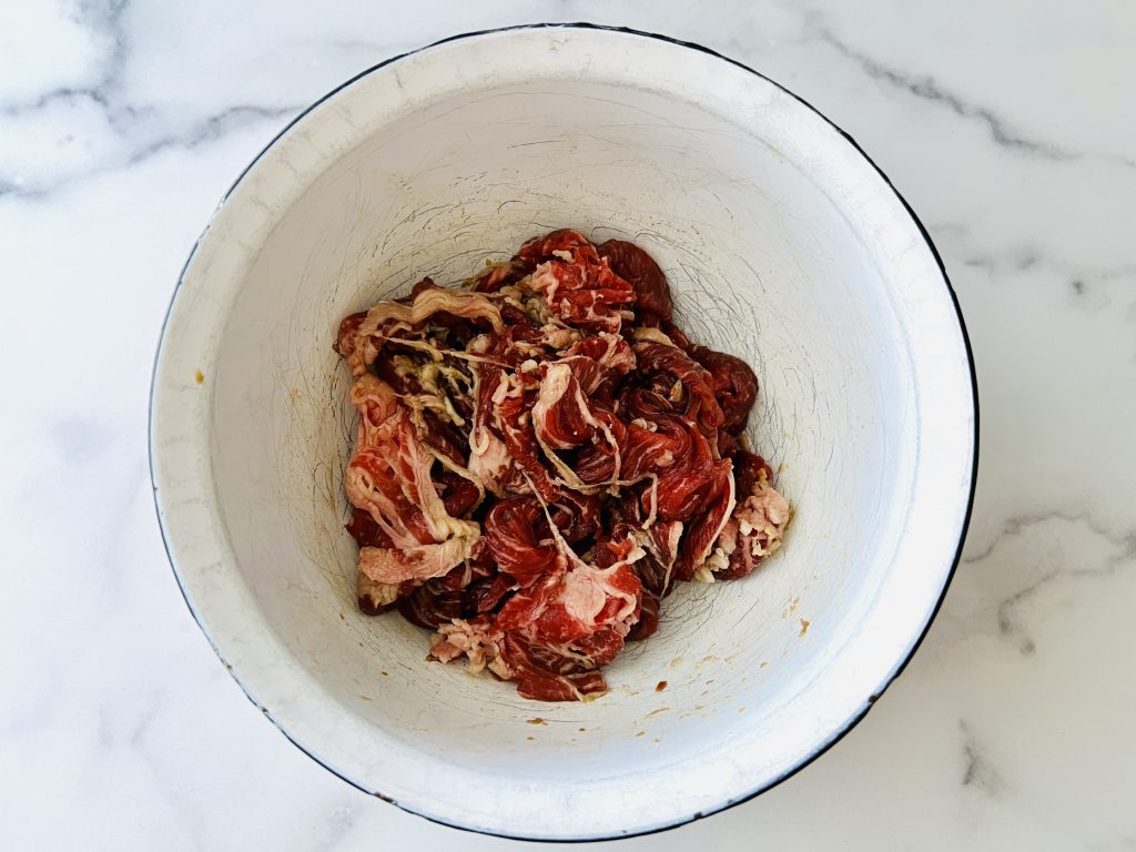• In a bowl, combine beef with minced garlic, soy sauce, mirin and sugar. Marinate for at least 1 hour or up to 24 hours.