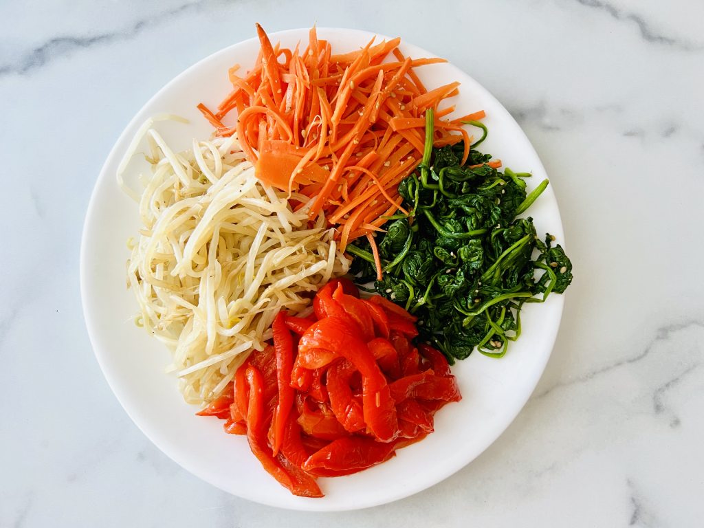 • Season each vegetable separately with ½ tbsp sesame oil, 1 tsp soy sauce, 1 tsp sesame seeds, and salt. Mix well and set aside.