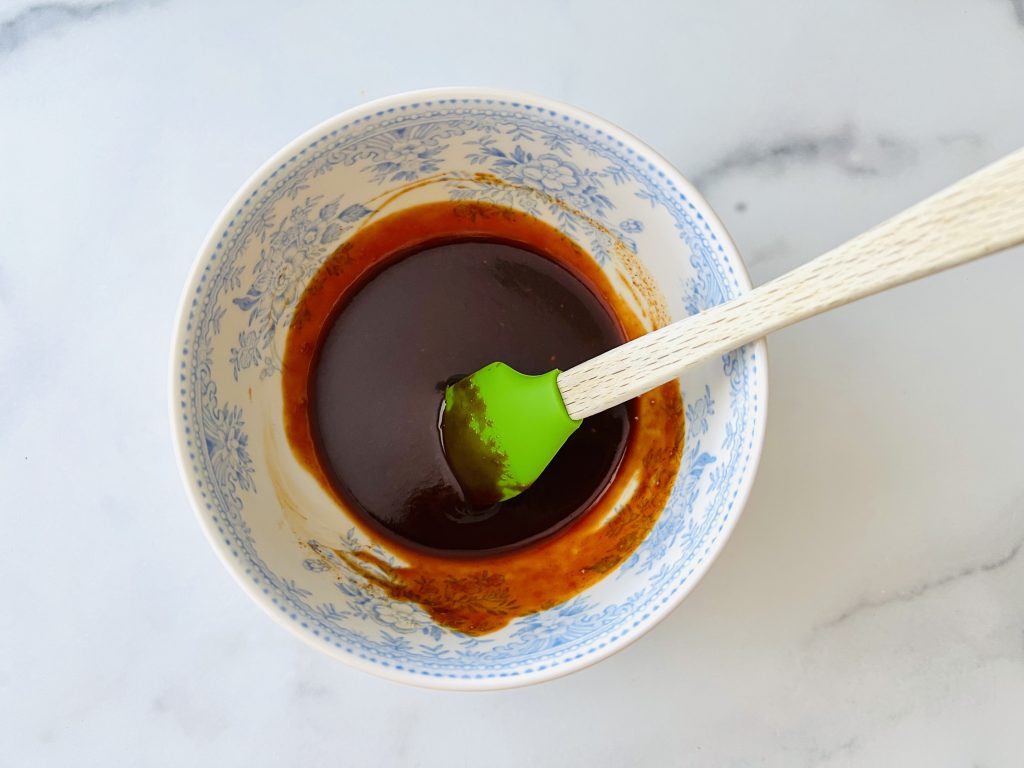• In a small bowl, combine gochujang, apple cider vinegar, soy sauce, sugar and sesame oil. Set aside.