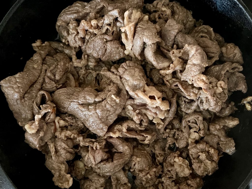 When ready to cook, heat a large skillet over medium heat and sear the beef until nicely browned. If your beef is lean, add a bit of oil to the pan. I skipped this step since my beef had enough natural fat.