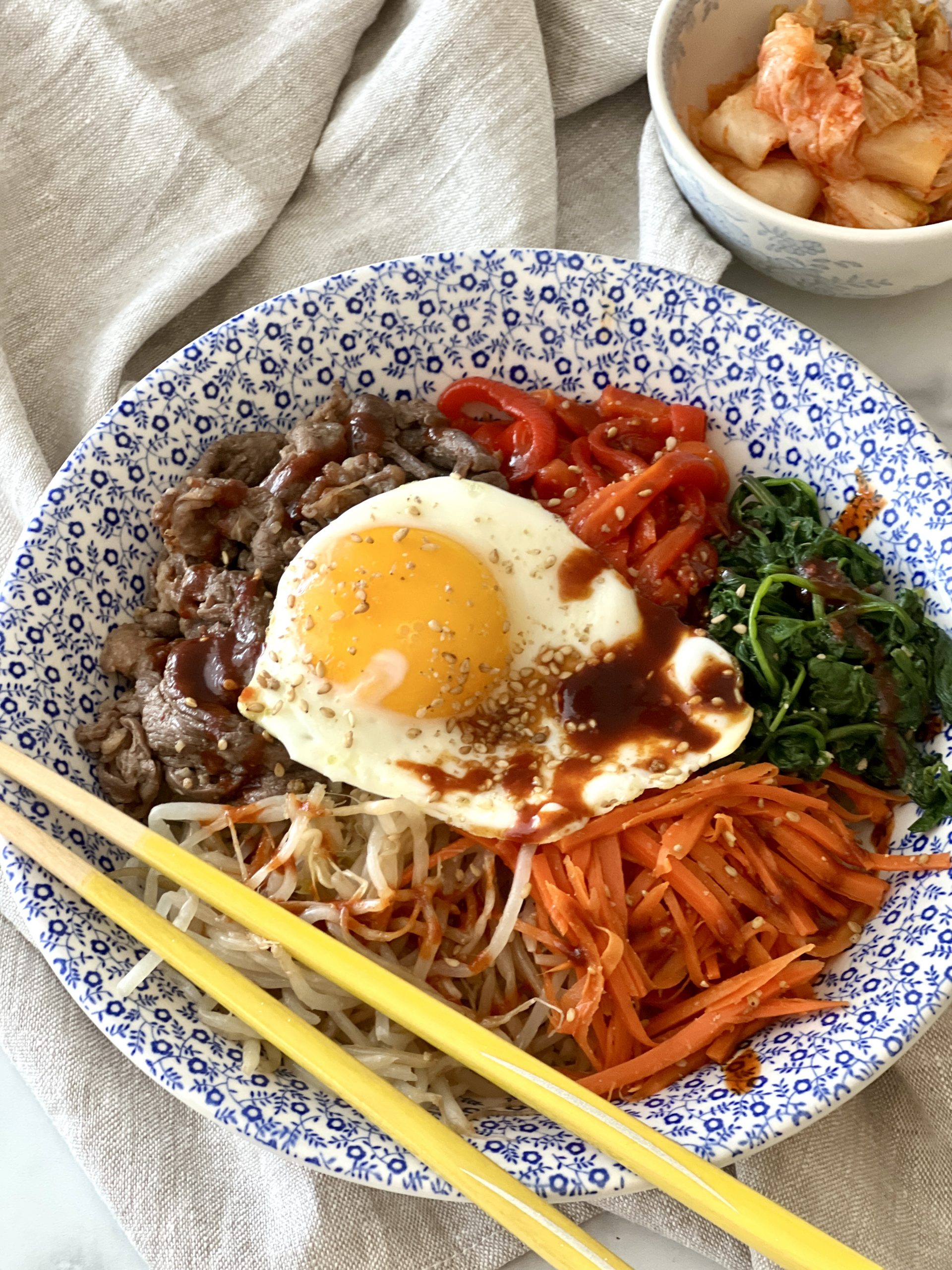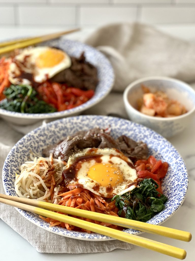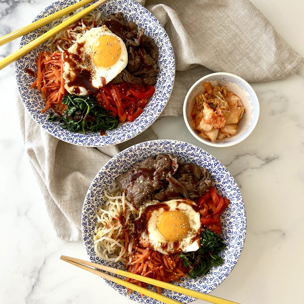 I like to serve bibimpap with a side of kimchi for an extra layer of flavor.