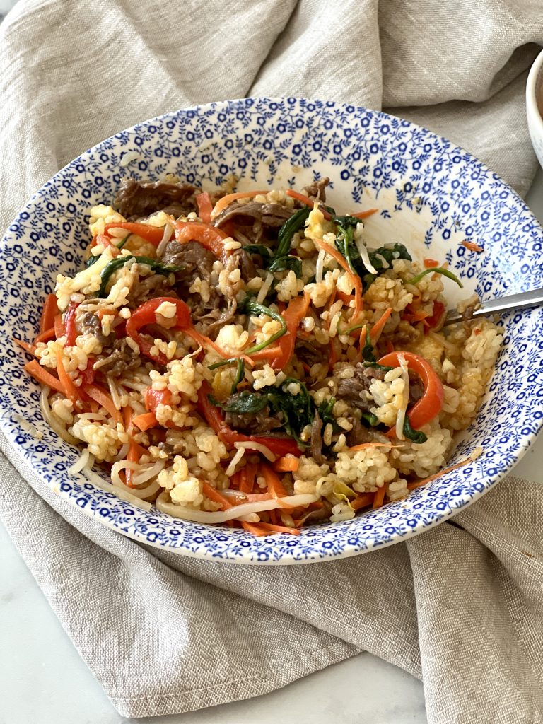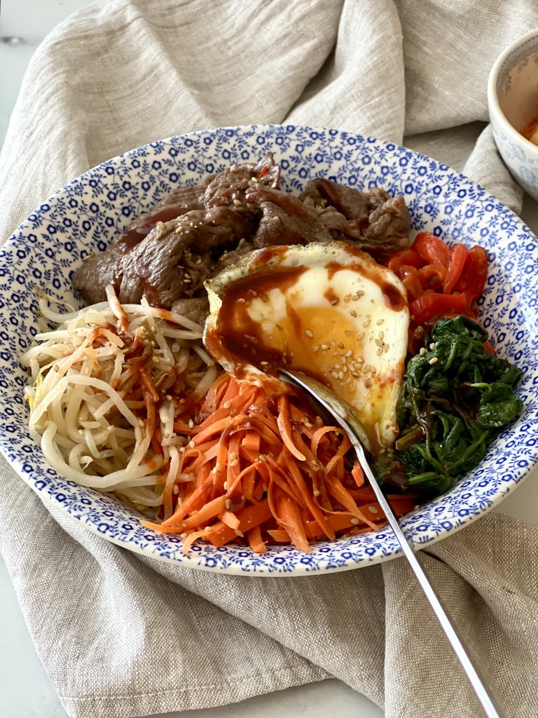 Bibimbap is one of those dishes that feels both nourishing and indulgent, with tender beef, fresh vegetables, a runny fried egg, and rich gochujang sauce over warm rice.