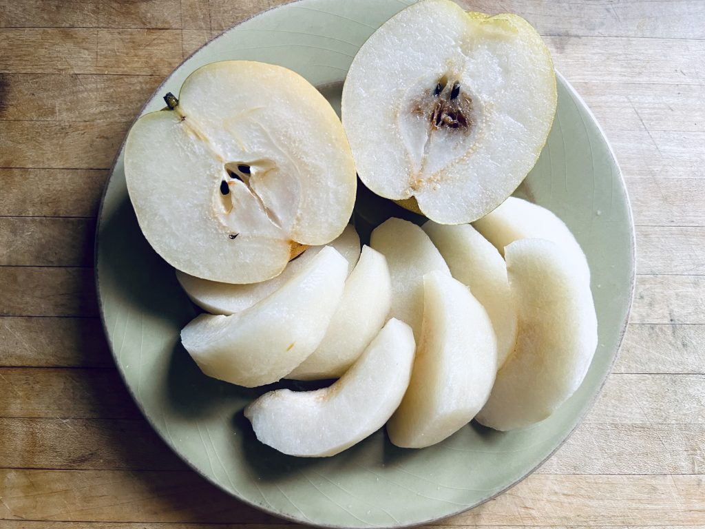 - 2 small apple pears peeled, cored and slice each pear into eight segments.