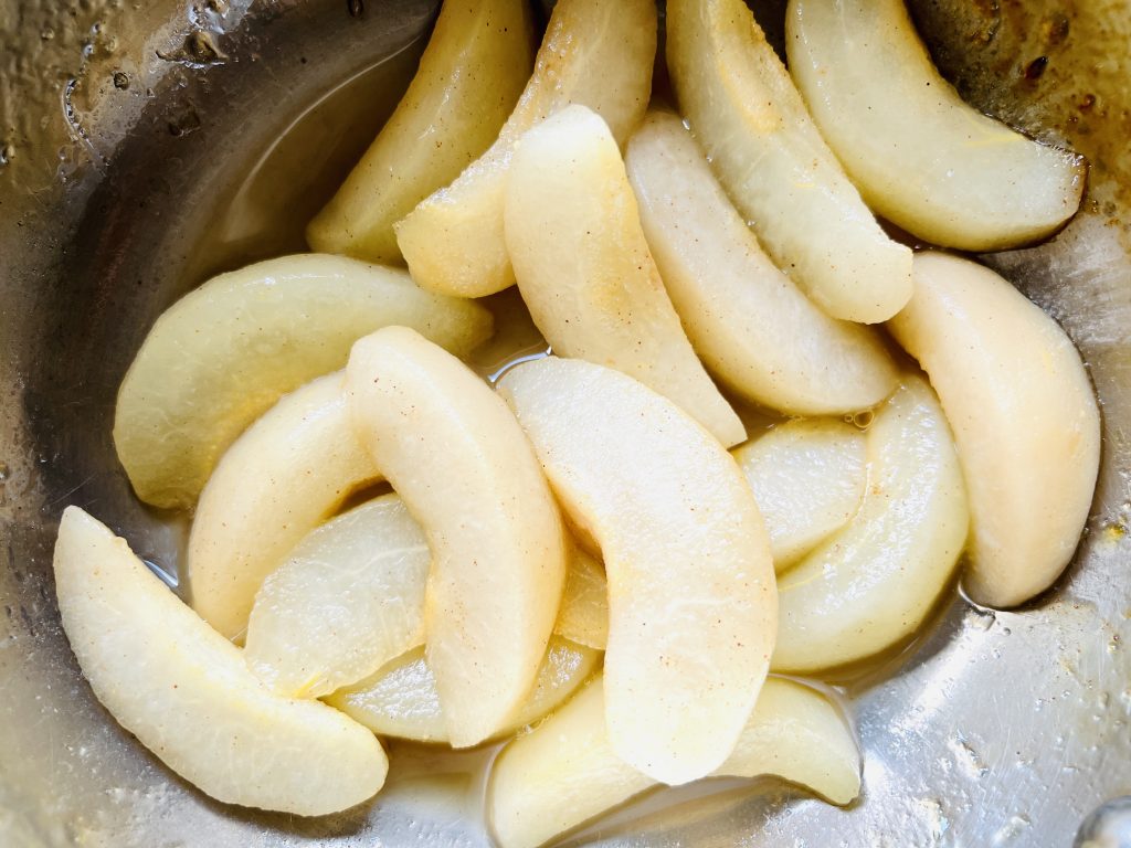 - Cook sliced pears and lemon juice for 5 minutes over medium heat.