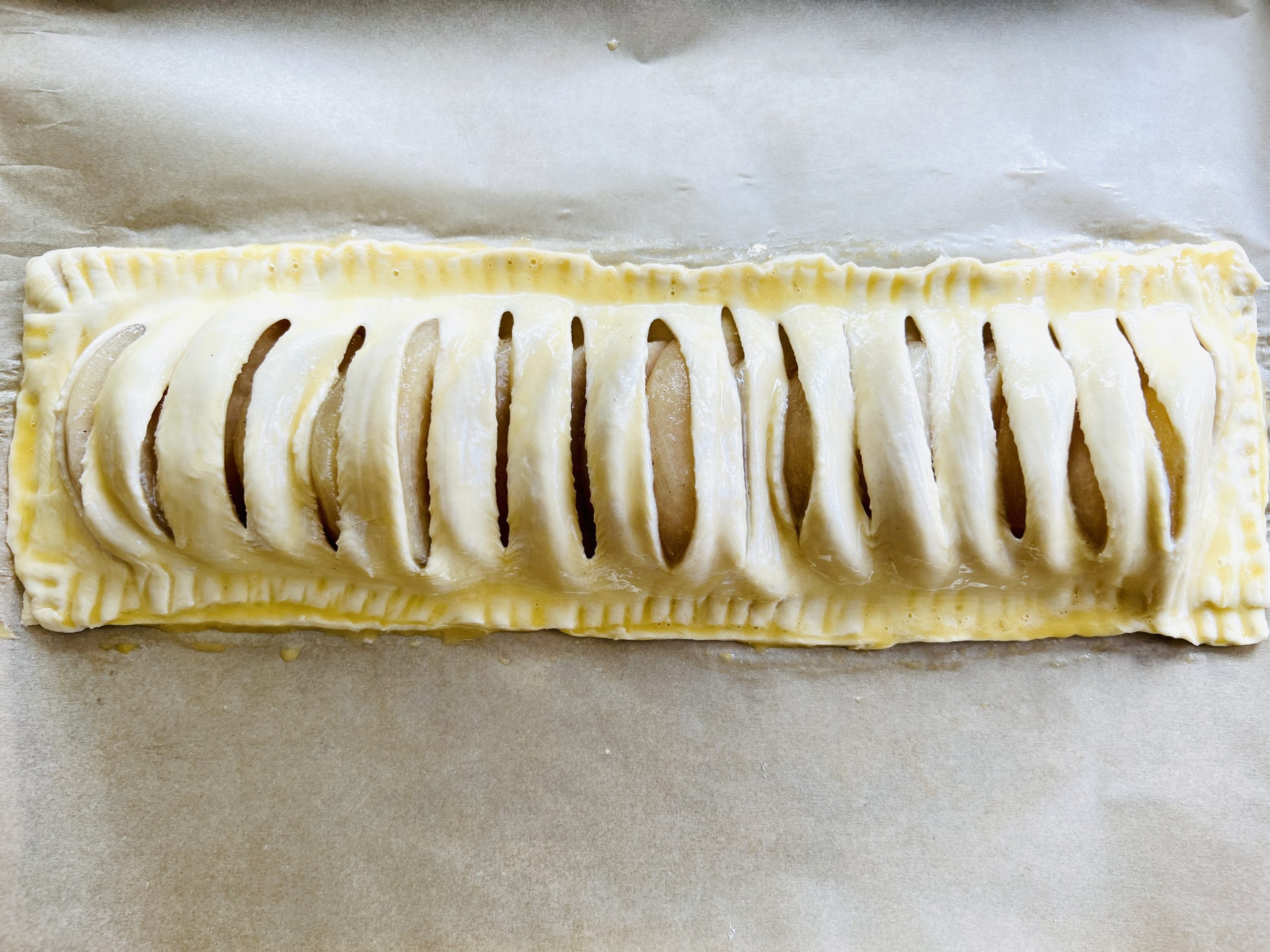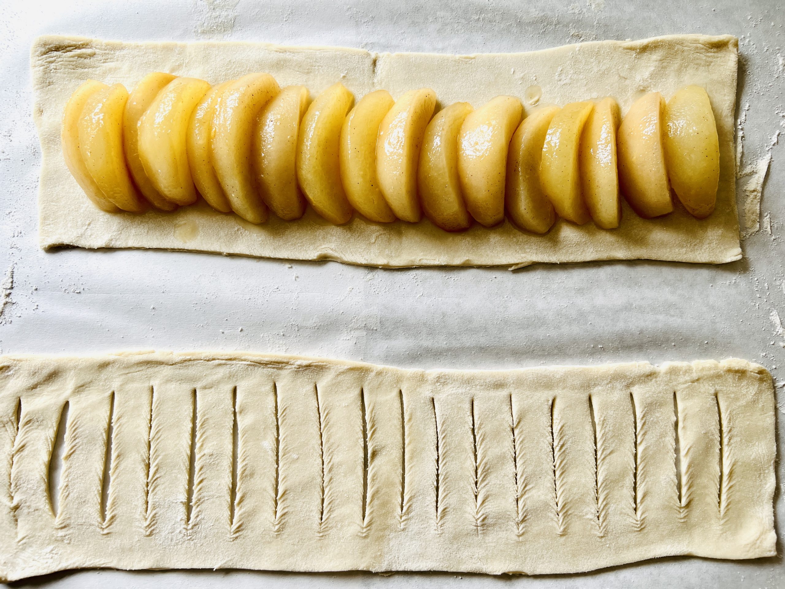 - Transfer the puff pastry rectangle (one without slits) onto the baking sheet so you can arrange apple pear slices snugly across the puff pastry.