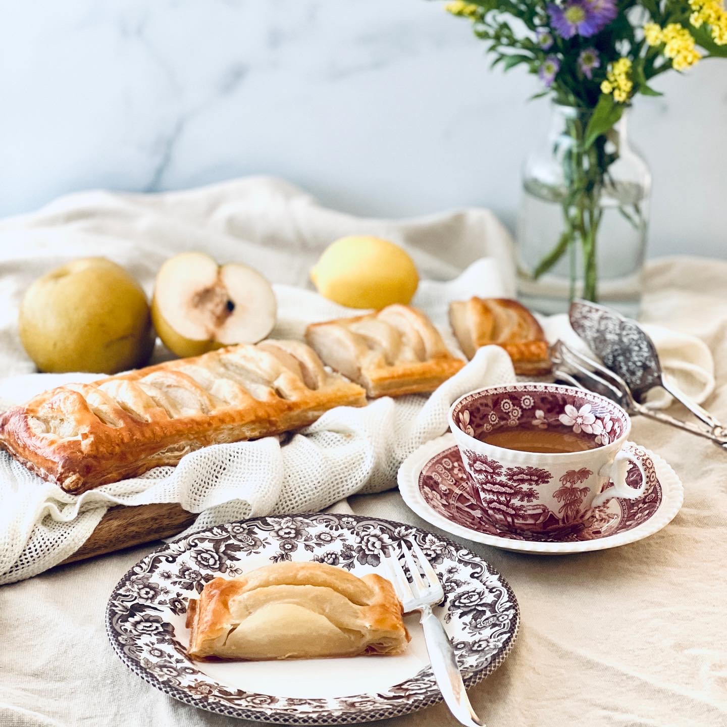 Just like all lovely tarts and pies, serve this puff pastry pear slab pie for dessert, breakfast or as an accompaniment for tea which is what I served for a friend who loved it! To get into the seasonal mood, I served the warm delicious slab pie and cup of tea in my fall themed Spode pieces; Pink Tower and Delamere Brown. You can find vintage Pink Tower pieces on platforms like Etsy, Ebay, and new Delamere pieces from Spode or Wayfair to name a few!