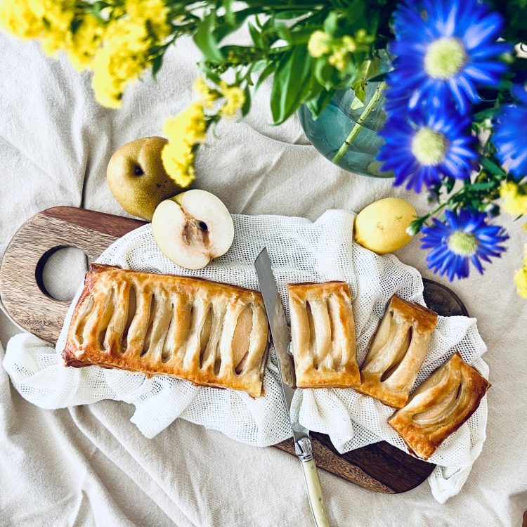 Apple pears are in season, so I decided to bake a puff pastry pear slab pie. I know this is my third post in a row with a puff pastry recipe, but you can’t go wrong with pies and tarts made with puff pastry.!