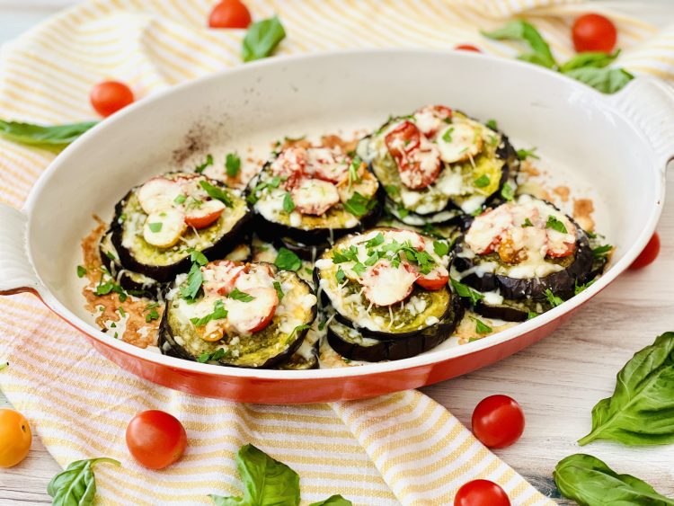 This Roasted Eggplant and Cherry Tomato Stacks are a fresh, summer-ready dish made with roasted eggplant, pesto sauce, sweet cherry tomatoes, and melty cheese.